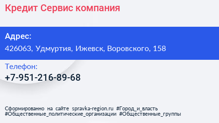 Кредит-Сервис, компания по адресу 426063, Удмуртия, Ижевск, Воровского, 158 в дальнейшем Организация, размещена в следующих категориях: