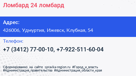 Ломбард 24, ломбард по адресу 426006, Удмуртия, Ижевск, Клубная, 54 в дальнейшем Организация, размещена в следующих категориях: