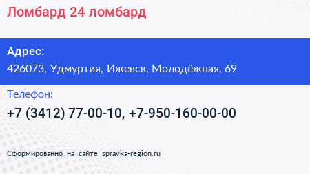 Ломбард 24, ломбард по адресу 426073, Удмуртия, Ижевск, Молодёжная, 69 в дальнейшем Организация, размещена в следующих категориях: