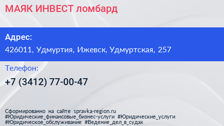 МАЯК-ИНВЕСТ, ломбард по адресу 426011, Удмуртия, Ижевск, Удмуртская, 257 в дальнейшем Организация, размещена в следующих категориях: