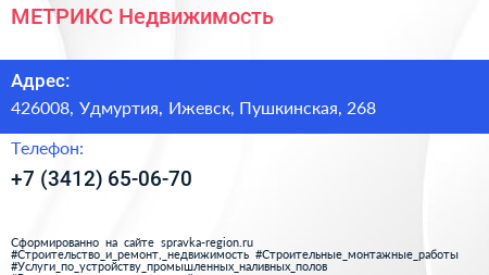 МЕТРИКС-Недвижимость по адресу 426008, Удмуртия, Ижевск, Пушкинская, 268 в дальнейшем Организация, размещена в следующих категориях: