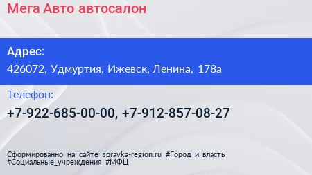Мега-Авто, автосалон по адресу 426072, Удмуртия, Ижевск, Ленина, 178а в дальнейшем Организация, размещена в следующих категориях: