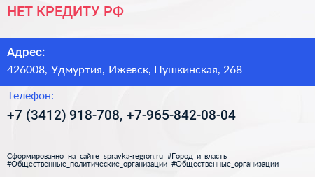 НЕТ-КРЕДИТУ.РФ по адресу 426008, Удмуртия, Ижевск, Пушкинская, 268 в дальнейшем Организация, размещена в следующих категориях: