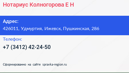 Нотариус Колногорова Е.Н. по адресу 426011, Удмуртия, Ижевск, Пушкинская, 286 в дальнейшем Организация, размещена в следующих категориях: