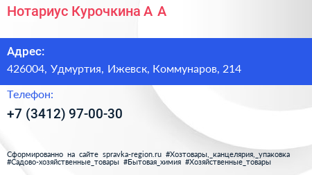Нотариус Курочкина А.А. по адресу 426004, Удмуртия, Ижевск, Коммунаров, 214 в дальнейшем Организация, размещена в следующих категориях: