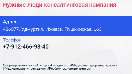 Нужные люди, консалтинговая компания по адресу 426077, Удмуртия, Ижевск, Пушкинская, 163 в дальнейшем Организация, размещена в следующих категориях: