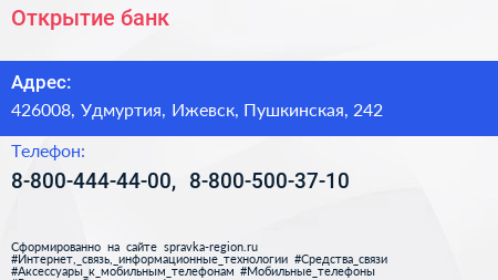 Открытие, банк по адресу 426008, Удмуртия, Ижевск, Пушкинская, 242 в дальнейшем Организация, размещена в следующих категориях: