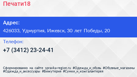 Печати18 по адресу 426033, Удмуртия, Ижевск, 30 лет Победы, 20 в дальнейшем Организация, размещена в следующих категориях: