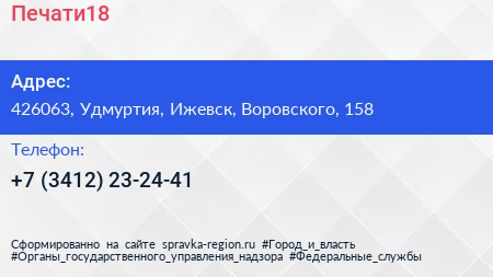 Печати18 по адресу 426063, Удмуртия, Ижевск, Воровского, 158 в дальнейшем Организация, размещена в следующих категориях: