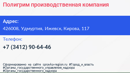 Полигрим, производственная компания по адресу 426008, Удмуртия, Ижевск, Кирова, 117 в дальнейшем Организация, размещена в следующих категориях: