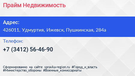 Прайм Недвижимость по адресу 426011, Удмуртия, Ижевск, Пушкинская, 284а в дальнейшем Организация, размещена в следующих категориях: