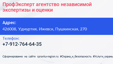 ПрофЭксперт, агентство независимой экспертизы и оценки по адресу 426008, Удмуртия, Ижевск, Пушкинская, 270 в дальнейшем Организация, размещена в следующих категориях: