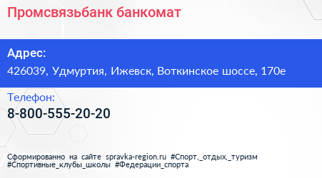 Промсвязьбанк, банкомат по адресу 426039, Удмуртия, Ижевск, Воткинское шоссе, 170е в дальнейшем Организация, размещена в следующих категориях: