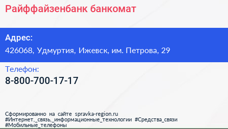 Райффайзенбанк, банкомат по адресу 426068, Удмуртия, Ижевск, им. Петрова, 29 в дальнейшем Организация, размещена в следующих категориях: