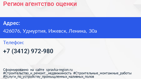 Регион, агентство оценки по адресу 426076, Удмуртия, Ижевск, Ленина, 30а в дальнейшем Организация, размещена в следующих категориях: