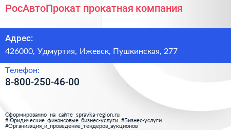 РосАвтоПрокат, прокатная компания по адресу 426000, Удмуртия, Ижевск, Пушкинская, 277 в дальнейшем Организация, размещена в следующих категориях: