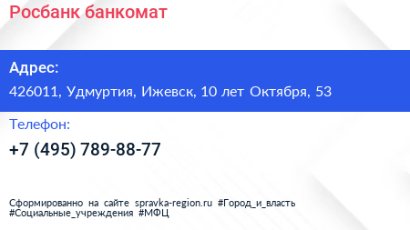 Росбанк, банкомат по адресу 426011, Удмуртия, Ижевск, 10 лет Октября, 53 в дальнейшем Организация, размещена в следующих категориях: