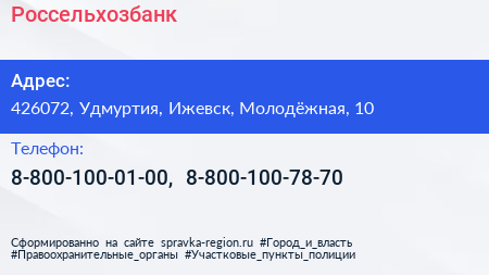 Россельхозбанк по адресу 426072, Удмуртия, Ижевск, Молодёжная, 10 в дальнейшем Организация, размещена в следующих категориях: