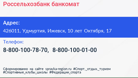 Россельхозбанк, банкомат по адресу 426011, Удмуртия, Ижевск, 10 лет Октября, 17 в дальнейшем Организация, размещена в следующих категориях: