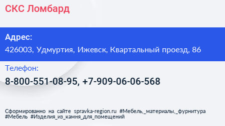 СКС Ломбард по адресу 426003, Удмуртия, Ижевск, Квартальный проезд, 86 в дальнейшем Организация, размещена в следующих категориях: