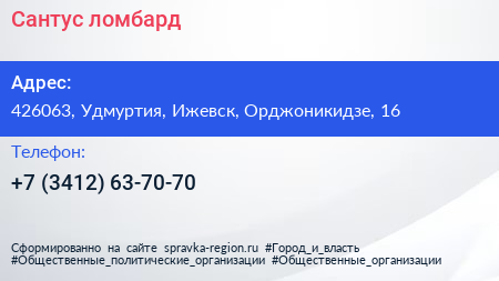 Сантус, ломбард по адресу 426063, Удмуртия, Ижевск, Орджоникидзе, 16 в дальнейшем Организация, размещена в следующих категориях: