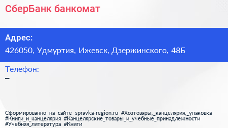 СберБанк, банкомат по адресу 426050, Удмуртия, Ижевск, Дзержинского, 48Б в дальнейшем Организация, размещена в следующих категориях: