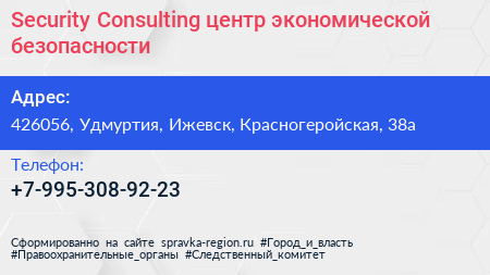 Security Consulting, центр экономической безопасности по адресу 426056, Удмуртия, Ижевск, Красногеройская, 38а в дальнейшем Организация, размещена в следующих категориях: