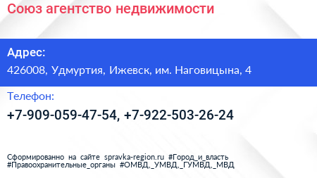 Союз, агентство недвижимости по адресу 426008, Удмуртия, Ижевск, им. Наговицына, 4 в дальнейшем Организация, размещена в следующих категориях: