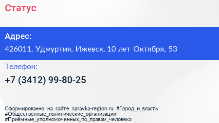 Статус по адресу 426011, Удмуртия, Ижевск, 10 лет Октября, 53 в дальнейшем Организация, размещена в следующих категориях: