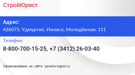 СтройЮрист по адресу 426073, Удмуртия, Ижевск, Молодёжная, 111 в дальнейшем Организация, размещена в следующих категориях:
