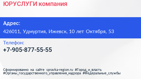 ЮРУСЛУГИ, компания по адресу 426011, Удмуртия, Ижевск, 10 лет Октября, 53 в дальнейшем Организация, размещена в следующих категориях: