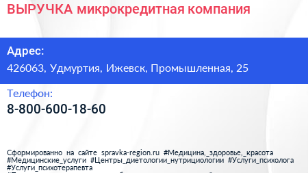 ВЫРУЧКА, микрокредитная компания по адресу 426063, Удмуртия, Ижевск, Промышленная, 25 в дальнейшем Организация, размещена в следующих категориях: