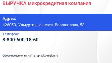 ВЫРУЧКА, микрокредитная компания по адресу 426053, Удмуртия, Ижевск, Ворошилова, 53 в дальнейшем Организация, размещена в следующих категориях: