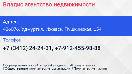 Владис, агентство недвижимости по адресу 426076, Удмуртия, Ижевск, Пушкинская, 154 в дальнейшем Организация, размещена в следующих категориях:
