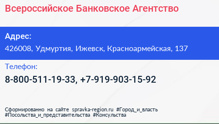 Всероссийское Банковское Агентство по адресу 426008, Удмуртия, Ижевск, Красноармейская, 137 в дальнейшем Организация, размещена в следующих категориях: