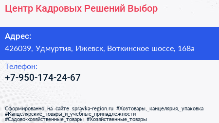 Центр Кадровых Решений Выбор по адресу 426039, Удмуртия, Ижевск, Воткинское шоссе, 168а в дальнейшем Организация, размещена в следующих категориях: