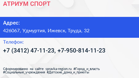 АТРИУМ-СПОРТ по адресу 426067, Удмуртия, Ижевск, Труда, 32 в дальнейшем Организация, размещена в следующих категориях: