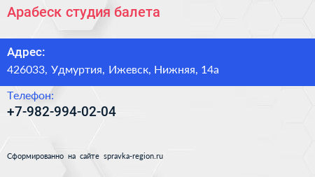 Арабеск, студия балета по адресу 426033, Удмуртия, Ижевск, Нижняя, 14а в дальнейшем Организация, размещена в следующих категориях: