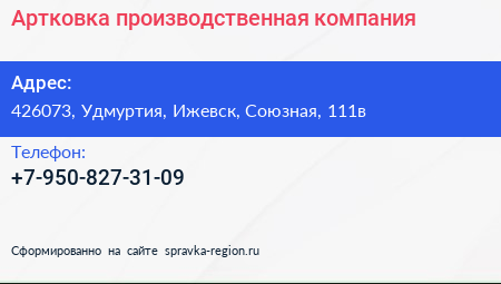 Артковка, производственная компания по адресу 426073, Удмуртия, Ижевск, Союзная, 111в в дальнейшем Организация, размещена в следующих категориях: