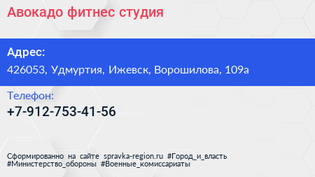 Авокадо, фитнес-студия по адресу 426053, Удмуртия, Ижевск, Ворошилова, 109а в дальнейшем Организация, размещена в следующих категориях: