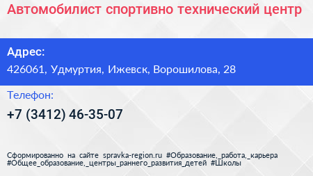 Автомобилист, спортивно-технический центр по адресу 426061, Удмуртия, Ижевск, Ворошилова, 28 в дальнейшем Организация, размещена в следующих категориях: