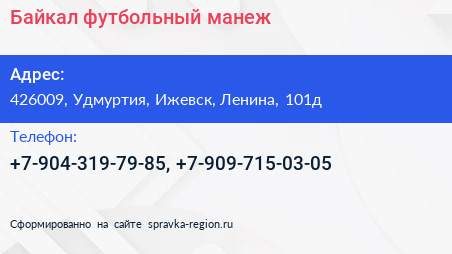 Байкал, футбольный манеж по адресу 426009, Удмуртия, Ижевск, Ленина, 101д в дальнейшем Организация, размещена в следующих категориях: