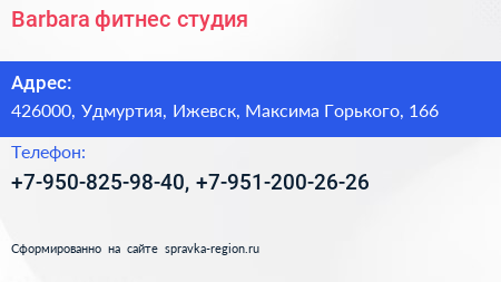 Barbara, фитнес-студия по адресу 426000, Удмуртия, Ижевск, Максима Горького, 166 в дальнейшем Организация, размещена в следующих категориях: