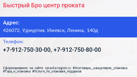 Быстрый Бро, центр проката по адресу 426072, Удмуртия, Ижевск, Ленина, 140д в дальнейшем Организация, размещена в следующих категориях:
