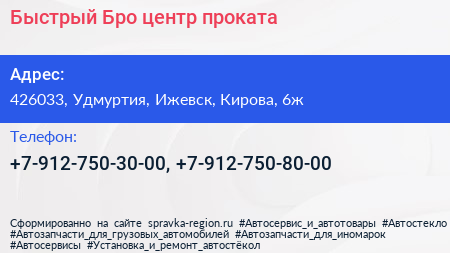 Быстрый Бро, центр проката по адресу 426033, Удмуртия, Ижевск, Кирова, 6ж в дальнейшем Организация, размещена в следующих категориях: