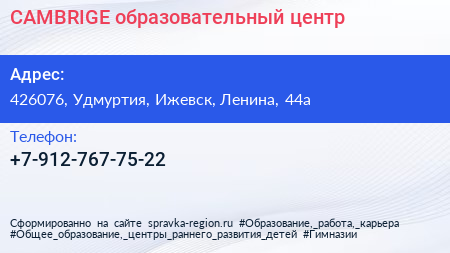 CAMBRIGE, образовательный центр по адресу 426076, Удмуртия, Ижевск, Ленина, 44а в дальнейшем Организация, размещена в следующих категориях: