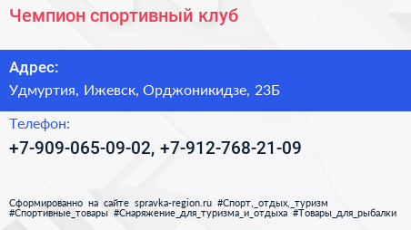 Чемпион, спортивный клуб по адресу Удмуртия, Ижевск, Орджоникидзе, 23Б в дальнейшем Организация, размещена в следующих категориях: