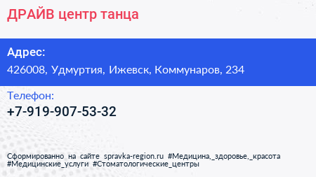 ДРАЙВ, центр танца по адресу 426008, Удмуртия, Ижевск, Коммунаров, 234 в дальнейшем Организация, размещена в следующих категориях: