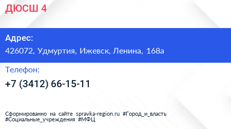 ДЮСШ №4 по адресу 426072, Удмуртия, Ижевск, Ленина, 168а в дальнейшем Организация, размещена в следующих категориях:
