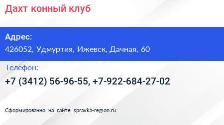 Дахт, конный клуб по адресу 426052, Удмуртия, Ижевск, Дачная, 60 в дальнейшем Организация, размещена в следующих категориях: